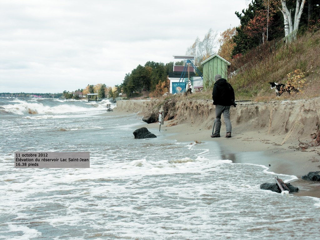 Le réservoir Saint-Jean s’agrandit chaque année. Sa circonférence est passée de 210 km à 260 km depuis 1910 et les berges ont reculé de 350 pieds15. L’Alcan et, par la suite, Rio Tinto ont régulièrement haussé le niveau du réservoir dans le cadre de leur gestion hydroélectrique, avec pour conséquences les dommages que dénoncent les nombreux riverains et riveraines.